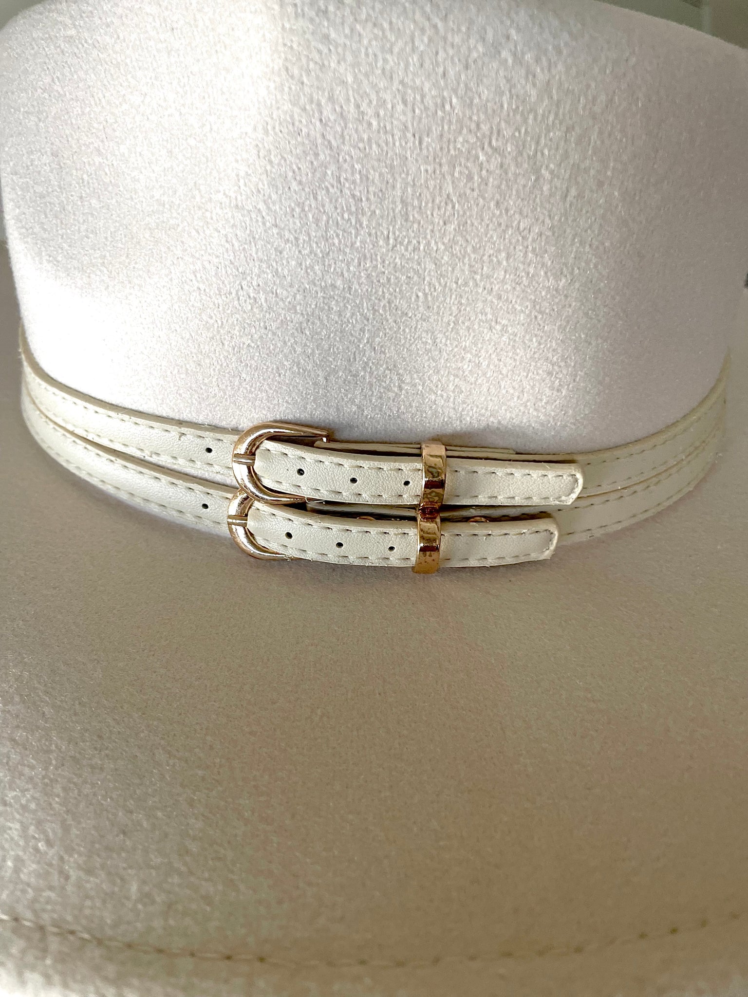 Faux Double Belted Straps, Gold Mini Buckle Detailing Constructed of Stone Polyester. Adjustable Strap Inside.
